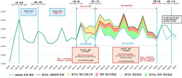 이를 위해 도는 코로나19 확산으로 소비가 급격히 줄었던 올해 2월 16일부터 중앙정부의 긴급재난지원금과 경기도의 재난기본소득 지급이 시작됐던 4월 12일까지의 소비추세를 분석했다. 그 결과 전년 같은 기간 대비 2,665억 원이 감소했음을 발견했다. 도는 긴급재난지원금이 지급되지 않는다면 이런 소비 감소추세가 8월 9일까지 이어질 수 있다는 가정아래 예측모형을 만들어 해당 기간의 소비액을 추정해 봤다. 분석 결과 4월 12일 ~ 8월 9일 사이 소비 추정액은 69조2,384억원으로 같은 기간 실제 소비액 78조 7,375억원보다 9조 4,991억원이 적었다.