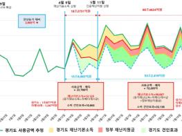 같은 방법으로 계산하면 실제 지급한 5조 1,190억원보다 4조 3,801억원의 추가 소비지출이 일어난 셈이다. 이는 전체 재난지원금 금액인 5조 1,190억원의 0.85배에 해당하는 것으로 도는 도민들에게 지급된 재난기본소득이 전년 대비 1.85배의 소비효과를 견인한 것으로 판단했다.