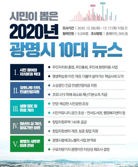 광명시는 이달 8일부터 17일까지 열흘 동안 광명시청 누리집(gm.go.kr)과 블로그, 페이스북, 카카오스토리를 통해 ‘2020년 광명시 10대 뉴스’ 시민 온라인 투표를 실시했다.