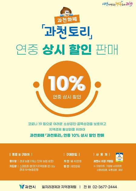 과천시는 코로나19 여파 등으로 침체된 지역상권의 매출을 증대하고 지역경제를 활성화 하고자 2021년도에는 지역화폐 「과천토리」를 연중 상시 10% 할인판매 할 계획이라고 23일 밝혔다.
