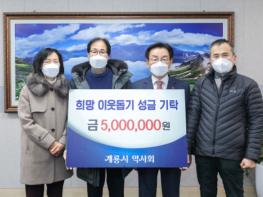 계룡시는 22일 계룡시 약사회와 ㈜중부주택관리산업에서 불우이웃을 돕기 위한 성금과 현물을 기탁해왔다고 밝혔다.