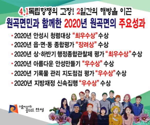 원곡면은 지난해 15개 읍면동평가에서 최하위 평가를 받았으나 금년도에는 2020년 안성시 청렴대상 ‘최우수상’ 수상을 시작으로 아름다운 안성만들기 ‘우수상’, 하반기 행정종합관찰제 평가 ‘최우수상’, 기록물 관리 지도점검 평가 ‘우수상’ 지방재정 신속집행 ‘우수상’ 등 우수한 성적을 거뒀으며, 2020년 안성시 읍면동 종합평가에서도 ‘장려상’을 수상하면서 지난해 최하위권에서 올해 안성시 각종 시책평가에서 최상위권으로 도약하는 꼴찌의 반란을 이루어 내며 원곡면의 위상을 드높였다.
