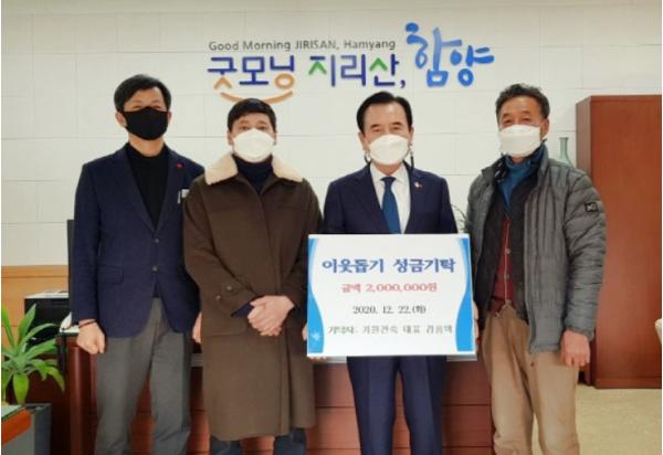함양군은 연말연시 소외계층 이웃돕기 성금모금을 위한 ‘희망 2021 나눔캠페인’이 시작된 가운데 전통이 깃든 한옥을 건축하는 ㈜가원건축 김홍택 대표가 이웃돕기 성금 200만원을 함양읍에 전달했다고 밝혔다.