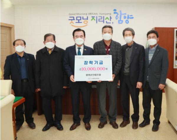 함양군 산림조합에서 23일 함양군청을 방문해 지역인재 양성을 위해 사용해 달라며 (사)함양군장학회에 장학금 1,000만원을 기탁했다.