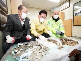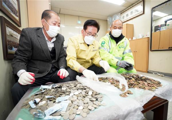 서울특별시 동대문구 소속 환경공무관과 유덕열 구청장이 2년 간 환경공무관들이 청소하며 주운 동전과 지폐를 장애인복지시설에 전달하기 위해 분리작업을 했다.