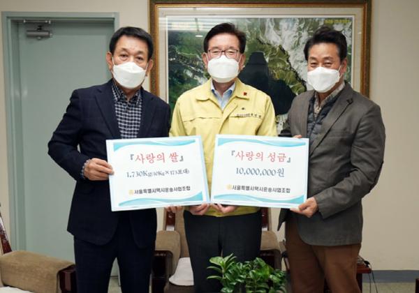 이날 오후 3시 문충석 서울특별시택시운송사업조합 이사장과 고영문 기획상무가 동대문구청을 찾아 어려운 이웃이 따뜻한 겨울을 보낼 수 있도록 필요한 곳에 써달라며 쌀 1,730kg(환가액 501만7천 원)과 성금 1천만 원을 전달했다.