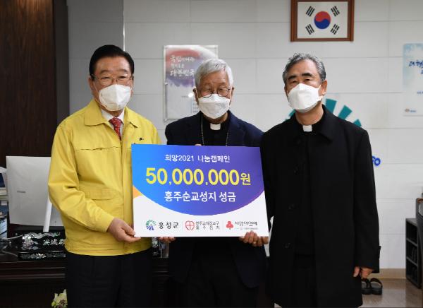 홍성군은 지난 22일 군수실에서 김석환 홍성군수, 대전교구 교구장 유흥식 라자로 주교, 최교성 신부 등이 참석한 가운데 성금 기탁식을 가졌다.