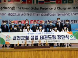 서천군이 지난 18일 서천국민체육센터에서 열린 2020 대전MBC배 온라인 서천국제오픈태권도대회에 맞춰 서천군청 직장운동경기부 태권도팀 창단식을 진행했다.
