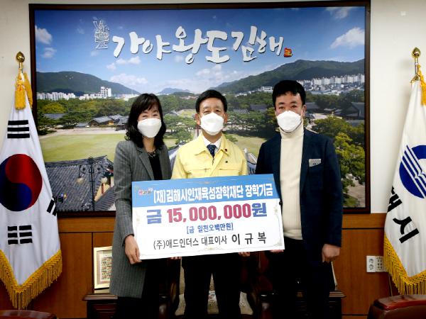 김해시인재육성장학재단은 23일 ㈜애드인더스(대표이사 이규복)에서 장학기금 1500만원을 기탁했다고 밝혔다.