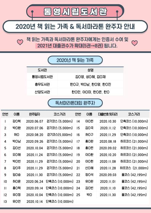 통영시는 2020년 책 읽는 가족 및 독서마라톤 완주자 시상을 코로나19 확산 방지를 위해 비대면 방식으로 진행한다. 따라서 별도의 시상식 없이 수상자들은 책 읽는 가족 인증서 및 독서마라톤대회 완주인증서를 우편을 통해 개별 수령하게 된다.