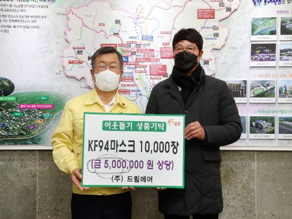 밀양시는 ㈜드림에어(대표 김종명)에서 23일 KF94마스크 만장(5백만원 상당)을 밀양시에 기탁했다고 밝혔다.