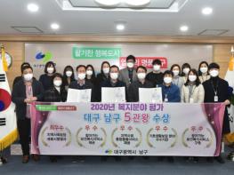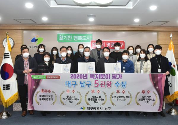 대구 남구는 2020년 지역복지사업 평가에서 △지역사회보장계획 시행결과 분야 ‘최우수상’ △찾아가는 보건복지서비스 제공 분야 ‘우수상’ △지역사회 통합돌봄서비스 제공 분야 ‘우수상’ △기초생활보장분야 우수기관 표창 등 복지행정상 총4개 분야에서 수상하였으며, 보건복지부장관 기관 표창과 함께 포상금 총3,350만원을 받았다. 또, △행정안전부 찾아가는 보건복지서비스 지원체계구축 분야 ‘우수상’으로 포상금1,000만원을 받아 복지 역대 최고의 성적을 거두었다.