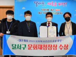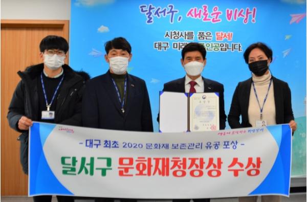 대구 달서구는 대구지역 최초 2020년도 지방자치단체 문화재 보존관리 유공단체로 선정, 문화재청장상을 수상했다고 밝혔다.