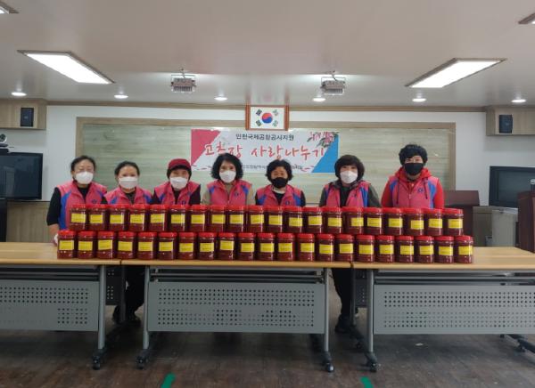 인천국제공항공사의 지원으로 이루어진 이번 행사에서는 생활개선회 회원 7명이 코로나19 상황을 감안하여 마스크를 착용하고 발열체크를 하는 등 예방수칙을 철저히 준수한 가운데 고추장 240kg을 만들어 저소득 가정 120세대에 직접 전달하며 안부인사를 나눴다.