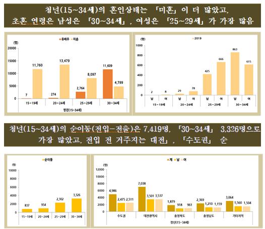 지난해 만 15~34세 청년의 세종 지역으로 순 이동은 7,419명이며, 청년의 세종 지역으로 전입인구 19,336명 중 전입 전 거주지는 대전(7,038명)과 수도권(4,986명)이 가장 많은 것으로 조사됐다.
