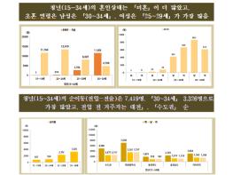 전입인구에서 전출인구를 뺀 순 이동은 7,419명으로, 대전과 수도권에서 전입이 많았다. 초혼연령은 남성 30~34세, 여성은 25~29세로 가장 많았다.