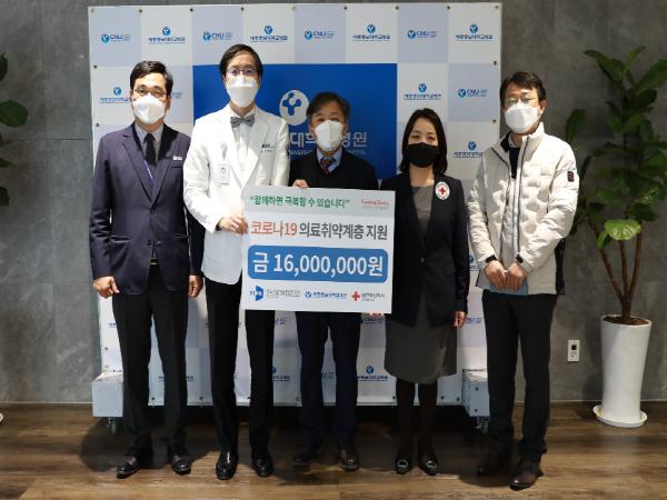 세종충남대병원은 12월 23일 4층 접견실에서 나용길 원장과 중소기업기술정보진흥원 장인성 기획조정본부장, 대전세종적십자사 최현복 사무처장 등이 참석한 가운데 중소기업기술정보진흥원에서 대전세종적십자사에 기탁한 의료 취약계층의 입원 및 치료비용 1600만원을 전달받았다.