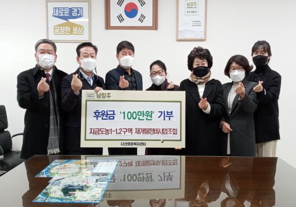 다산행정복지센터(센터장 김진현)는 지금도농1-1구역 재개발 정비사업조합(조합장 신재찬)과 지금도농2구역 재개발 정비사업조합(조합장 신미향)에서 지난 23일 각각 50만원씩, 총 100만원을 다산1동 지역사회보장협의체(위원장 정순옥)에 전달했다고 전했다.