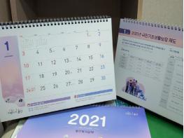 달력 뒷면에는 2021년 국민기초생활보장 제도, 복지대상자 주요 감면 및 지원제도, 복지대상자 신고의무사항과 어르신·한부모가족·영유아·아동청소년 등 세대별 복지정책을 일목요연하게 정리했다. 관련 복지기관 연락처, 교통편(문화셔틀버스)도 바로 확인 가능하다.