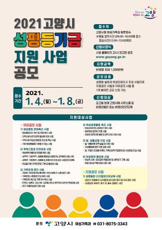 고양시가 2021년도 고양시 성평등기금 지원사업을 공모한다. 지원 금액은 총 9천만 원이며, 사업의 규모와 성격에 따라 최대 1천만 원까지 지원한다.