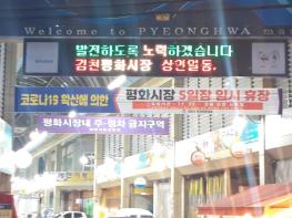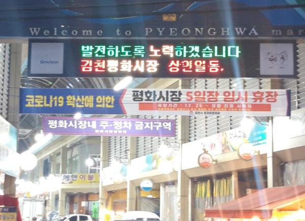 김천시는 2020년 연말 전국적으로 시행되는「연말연시 방역강화 특별대책」에 발맞추어, 평화·황금시장의 5일장(노점상) 운영을 12월 25일 장부터 코로나19 상황 진정 시까지 중단한다고 밝혔다.
