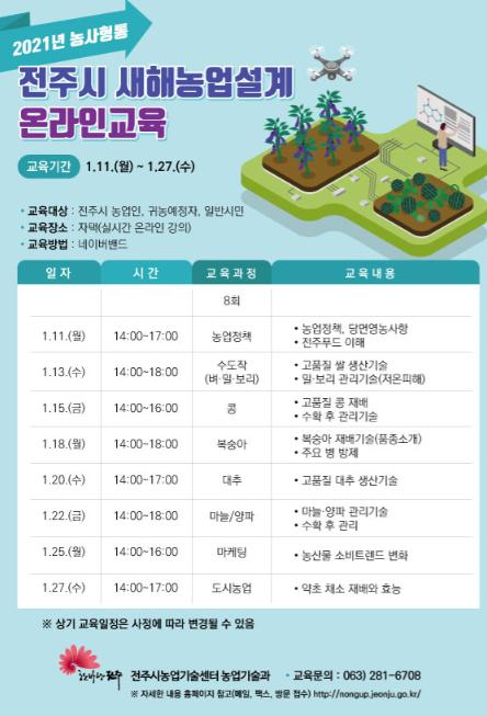 전주시농업기술센터 관계자는 “코로나19 확산에 따라 내년 새해영농설계교육을 온라인으로 기획하게 됐다”며 “시청이 자유로운 온라인 교육만의 장점을 활용해 많은 교육생들의 농업 역량을 강화하는 기회가 되길 바란다”고 말했다.