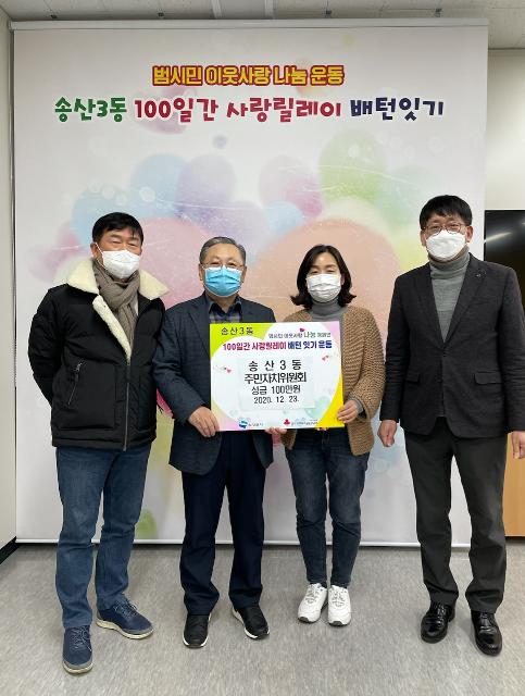 송산3동 주민자치위원회는 지난 12월 23일, 송산3동 행정복지센터(권역동 국장 윤무현) 복지지원과를 방문해 지역의 어려운 이웃을 위해 써달라며 성금 100만 원을 기탁했다.