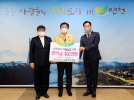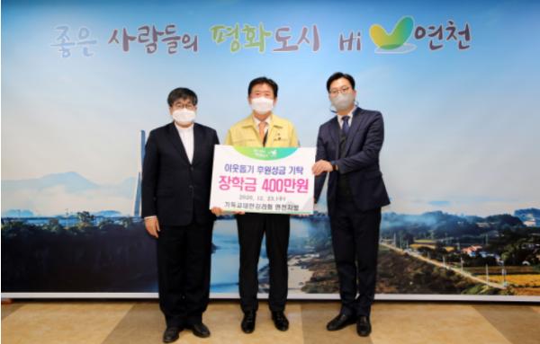 연천군은 기독교대한감리회 중앙연회 연천지방에서 23일 군수실을 방문하여 관내 소외된 어려운 청소년에게 지원하고자 장학금 400만 원을 기탁했다고 밝혔다.