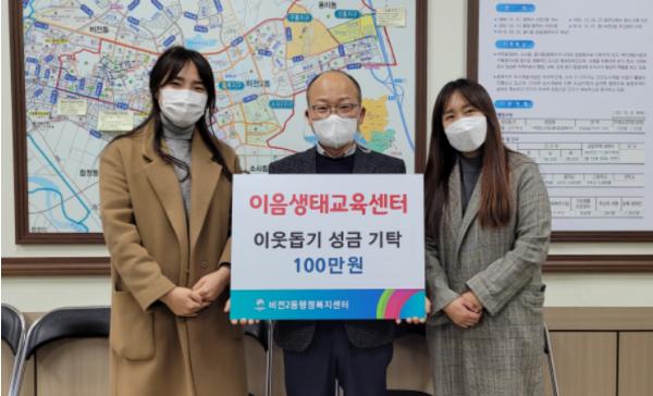 평택시 비전동 소재 이음생태교육센터는 23일 코로나19로 인한 지역사회 어려움을 나누고자 이웃돕기 성금 100만원을 비전2동행정복지센터에 기탁했다.