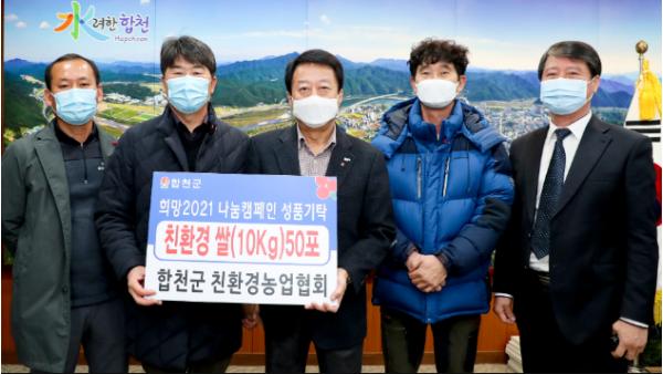합천군 친환경농업협회(회장 서임교)는 24일 합천군청을 방문하여 관내 어려운 이웃들을 지원해달라며 이웃돕기 성품으로 친환경 쌀(10kg) 50포를 기탁했다.