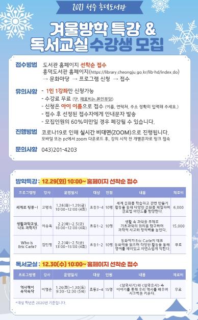 청주흥덕도서관이 2021년 1월 26일부터 2월 5일까지 진행되는 겨울방학 특강 및 독서교실의 수강생을 모집한다.