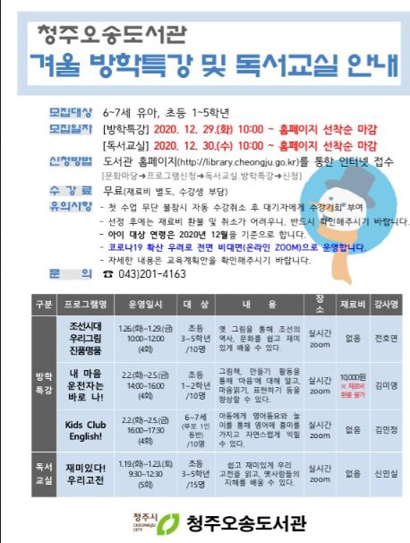 청주오송도서관이 겨울방학을 맞은 어린이들을 대상으로 운영하는 겨울방학특강 및 독서교실 수강생 모집을 각각 29일, 30일 10시부터 도서관 홈페이지를 통해 선착순 접수받는다.
