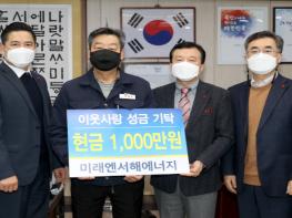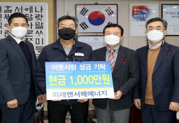 ‘미래엔서해에너지’가 지난 23일 태안군청 군수 집무실에서 가세로 군수, 회사 관계자 등이 모인 가운데 어려운 이웃을 위해 써달라며 1천만 원을 기탁했다.