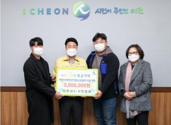 4-H연합회에서는 3백만 원의 성금을 이천시여자단기청소년쉼터 나르샤에 지정기탁하였다. 성금은 공동과제포에서 재배한 콩 판매 수익금으로 마련하였다.
