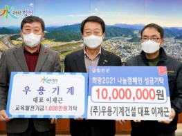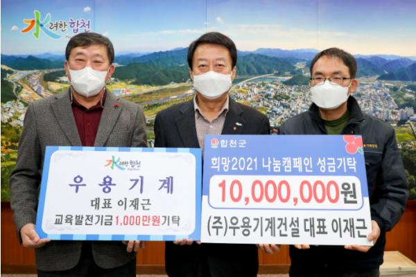 합천군 소재 우용기계건설(대표 이재근)은 26일 (사)합천군교육발전위원회(이사장 문준희)를 방문하여, 교육발전기금 1,000만원을 기탁했다.