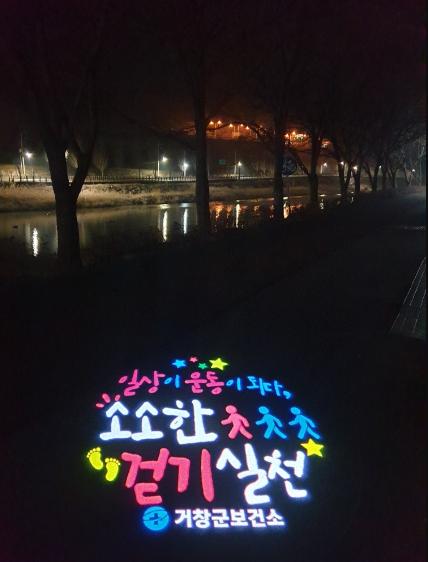 거창군은 이색적인 건강친화 환경 조성을 위해 왕래가 잦은 어두운 골목과 산책로 일원인 전통시장 내 문화거리 등 5개소에 건강생활실천 홍보를 위한 그림자 조명을 설치했다고 24일 밝혔다.