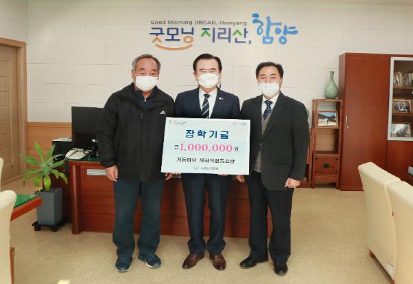 함양군은 24일 함양읍 기동마을 사회적협동조합(이사장 이태식)에서 함양군청을 찾아 (사)함양군장학회에 장학금 100만원을 기탁했다고 밝혔다.