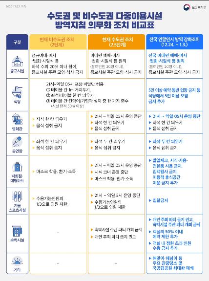 이번 특별방역 대책은 성탄절·연말연시의 특성을 고려해 종교시설·요양시설 등 고위험시설과 모임·파티 및 관광·여행 등에 대해 전국 코로나19 사회적 거리두기를 단기적으로 강화한 것이다.