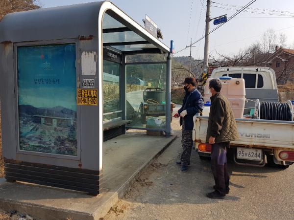 김천시 감천면 발전협의회(회장 김종화) 회원 30여명은 12월 24일 오전10시 김천시 일제방역의 날을 맞아 코로나19 바이러스 확산을 막기 위해 버스승강장 등에 방역활동을 실시하였다.