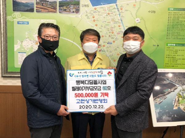 고현상가번영회는 고현시장의 상인들로 구성된 단체로 평소에도 지역사회발전을 위해 나눔을 실천하고 있으며 매년 고현동에 이웃돕기 성금을 기탁해오고 있다.
