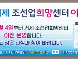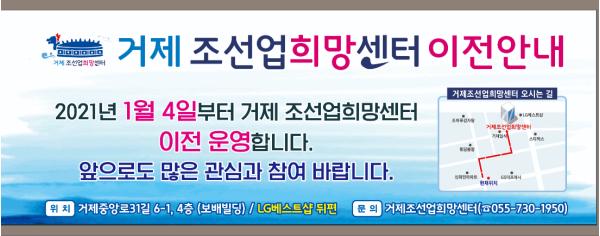 거제 조선업희망센터가?2021년 1월 4일부터 현 국민은행 3층(고용복지플러스 센터 내)에서?고현 LG베스트 샵 뒤편 건물 보배빌딩 4층으로 이전하여 운영한다.