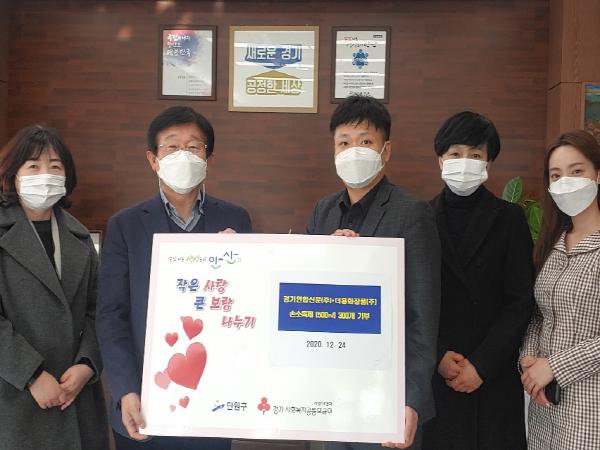 안산시 단원구는 경기연합신문㈜(대표 홍희준)·더홍화장품㈜(대표 여규진)로부터 손소독제 300개(500㎖, 360만 원 상당)를 기탁 받아 관내 사회복지시설에 전달했다고 24일 밝혔다.