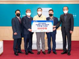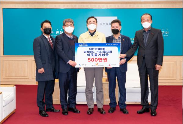 대한건설협회 경상북도 구미시협의회(회장 김화진)는 12월24일 구미시를 방문해 행복나눔 이웃돕기 성금 500만원을 전달하였다.