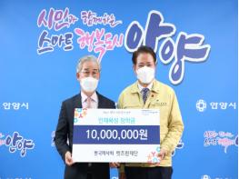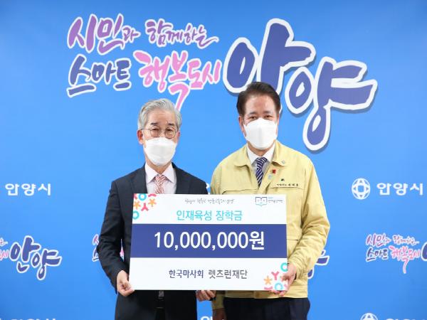 안양시 인재육성재단(이사장 최대호)은 23일 한국마사회 렛츠런재단(이사장 김낙순)이 장학금 1천만 원을 기탁했다고 24일 밝혔다.