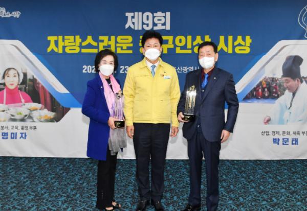 제9회 자랑스러운 중구인상 수상 대상자는 효행·봉사·교육·환경 부문에 명미자 전문자원봉사단협의회장, 산업·경제·문화·체육 부문에 박문태 중구문화원장이다.