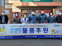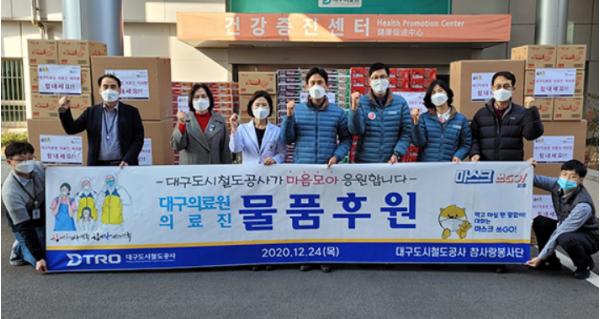 대구도시철도공사는 12월 24일 코로나19 환자 치료에 최선을 다하고 있는 지역 의료진을 지원하기 위해 대구의료원에 1천 5백만 원 상당의 후원 물품을 전달했다고 밝혔다.