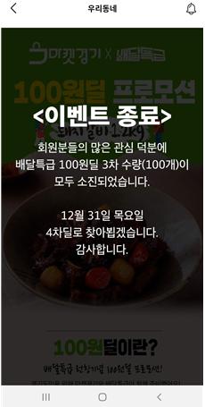 특히 ‘배달특급X마켓경기 100원딜’ 이벤트는 경기도내로 배달을 받는 사람이라면 거주지에 관계없이 누구나 참여할 수 있어 회원들의 인기가 더욱 높은 것으로 파악되고 있다.