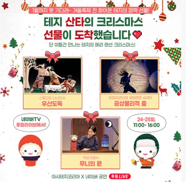 ‘테지의 메리 랜선 크리스마스’는 ‘제28회 서울어린이연극상’ 3관왕의 '우산도둑', ‘무용수 아빠’가 아이들을 위해 만든 무용극 '공상물리적 춤', 테이블 인형극 '무니의 문' 세 작품으로 구성되어있다. 크리스마스마저 코로나에 빼앗긴 아이들에게 특색있는 ‘랜선 외출’을 선물하고 싶다면 ‘네이버TV아시테지코리아채널’에서 크리스마스이브와 당일 오전 11시부터 다섯시간 동안 5,000원의 후원하기 기능을 통해 위 세 공연을 만나볼 수 있다.