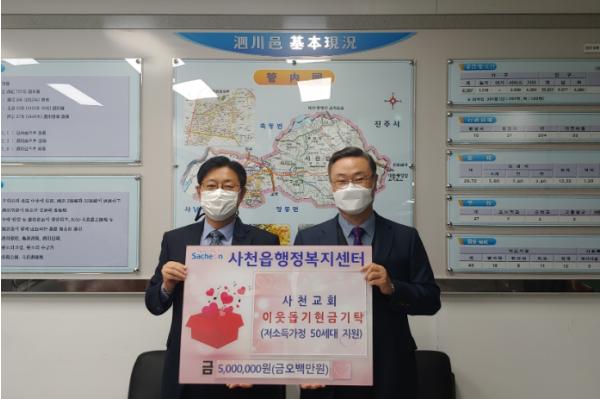 사천시 사천읍 평화리 소재 사천교회(목사 정계규)에서 12월 24일 사천읍행정복지센터를 방문해 연말을 맞아 저소득 가정을 위해 이웃돕기 성금 500만원을 기탁했다.