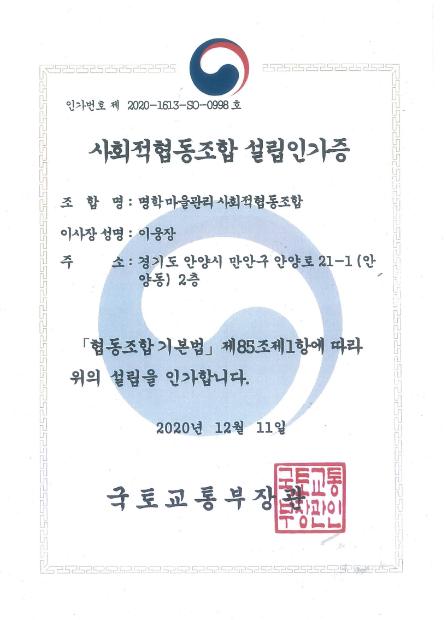 안양 명학 마을관리 사회적협동조합이 국토교통부로 12월 11일자 설립인가를 받았다고 안양시가 22일 밝혔다.
